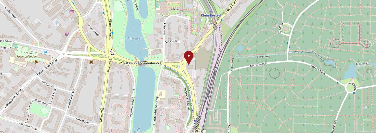 Kommen Sie mit öffentlichen Verkehrsmitteln, so finden Sie uns 50 Meter zu Fuß vom Bahnhof der U1 "Klein Borstel" entfernt.